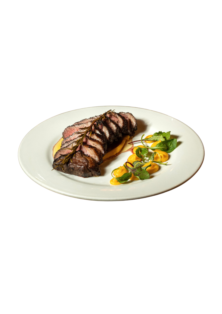 Servido con papas a la francesa, brotes, aguacate, jitomate deshidratado, panceta,